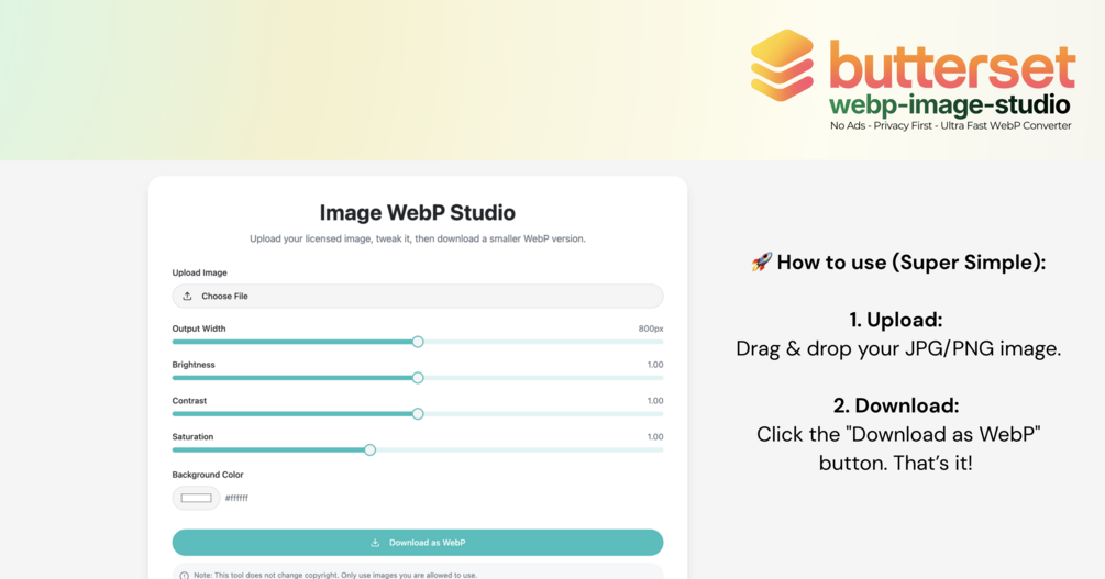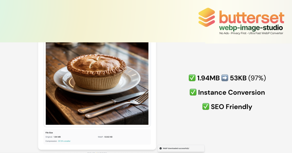 - ⚡ Ultra Fast Workflow: Drag, drop, and get your SEO-optimized WebP files instantly.